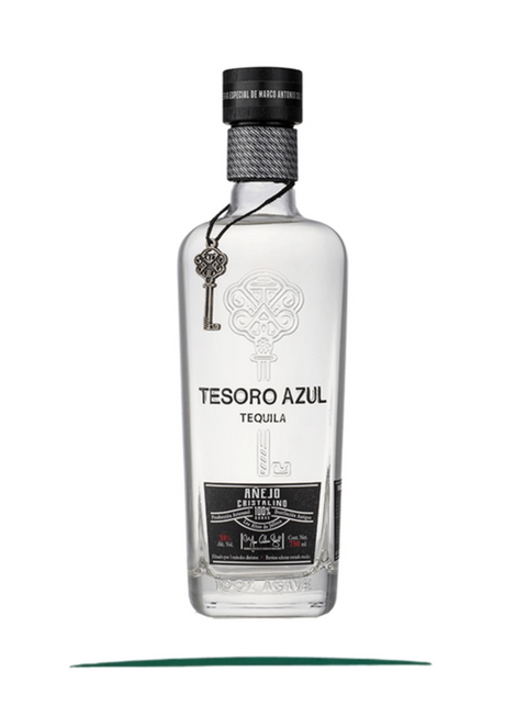 Notas del orador Tesoro Azul Añejo Cristalino es un tequila cristalino 100% agave elaborado en las tierras altas de Jalisco, México. Está elaborado con agave tequilana de la más alta calidad y se añeja durante al menos 18 meses en barricas de roble americano y francés. Este proceso de añejamiento le da al tequila un sabor complejo y equilibrado con notas de agave, caramelo, vainilla, especias y frutas.